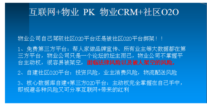 11、即支持“公有云”應用,也支持“私有云(物業(yè)自建數(shù)據(jù)中心)”應用,“數(shù)據(jù)”才是物業(yè)最核心的資產(chǎn)?!暗谌矫赓M平臺”應用幫人家做品牌宣傳、所有業(yè)主等大數(shù)據(jù)都在第三方平臺,物業(yè)公司只是一個論壇的壇主而已,物業(yè)公司不掌握平臺主動權,很容易被架空,面臨法律風險以及被人架空的風險。